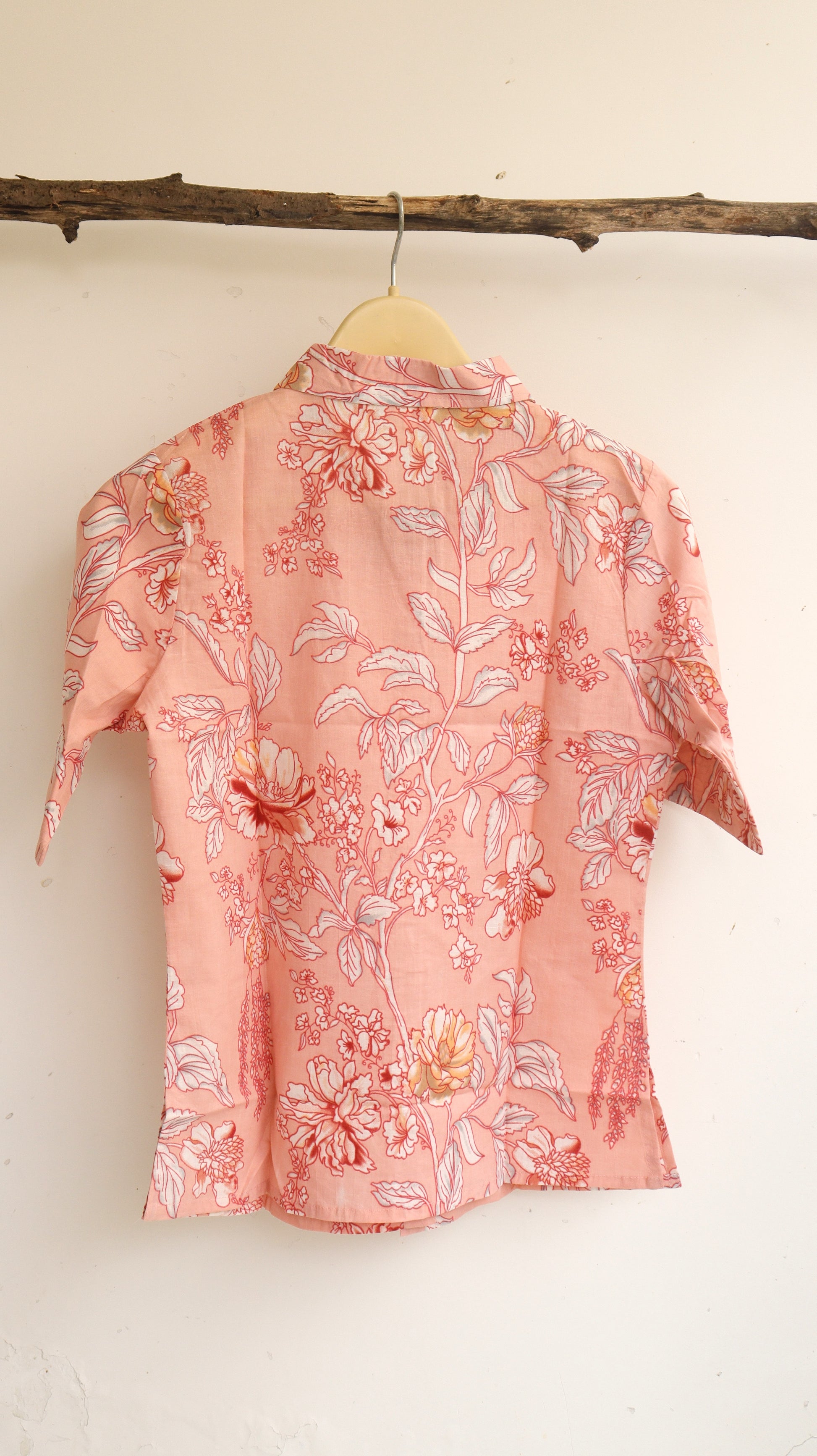 Add a warm pop of color with The Coral Bloom Shirt. This beautiful half-sleeve cotton top has a bright floral print in a cheerful peach/coral hue. It's built for comfort with soft, breathable fabric and a relaxed, easy fit.